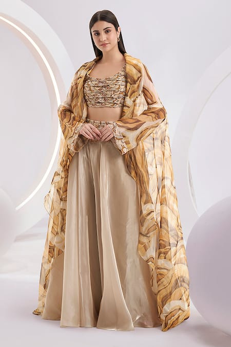 Yellow Organza Printed Beads Round Abstract Pattern Cape Pant Set