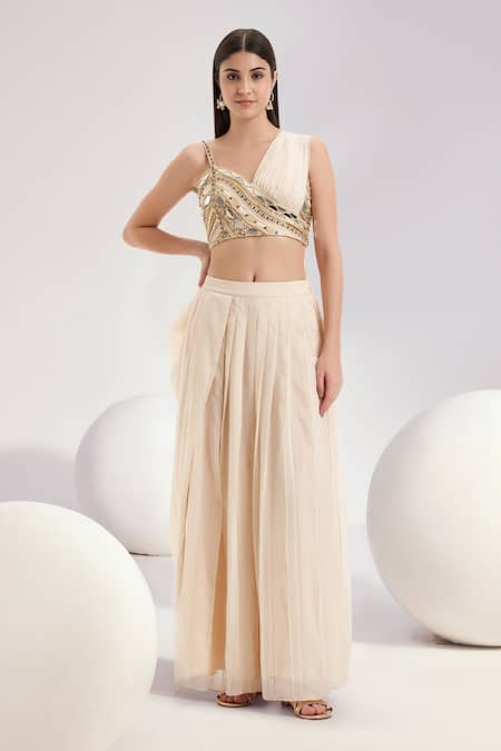 Ivory Chiffon Hand Embroidered Mirror Asymmetric Neck Blouse And Skirt Set