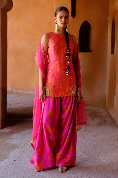 Pink Silk, Dupion, Organza Sequins, Zari, Mirrors Suhana Shibori Kurta Set