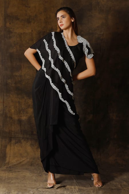Black Crepe, Muslin Embroidery V-neck Asymmetric Cape And Draped Skirt Set