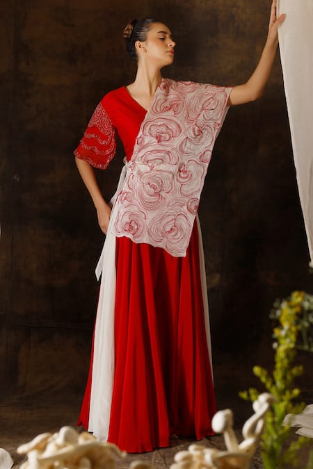 Red Satin, Organza, Crepe Cut Work V-neck Embroidered Top And Flared Pant Set