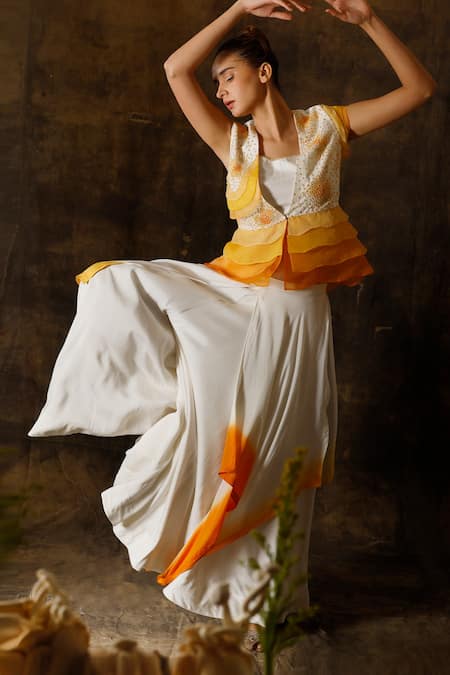 Ivory Organza, Muslin, Silk Embroidery, Pearls Hand Jacket Gharara Pant Set