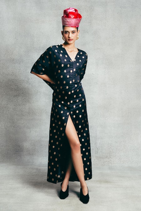 Black Satin Zari V-neck Banarasi Cutwork Dot Motif Kaftan