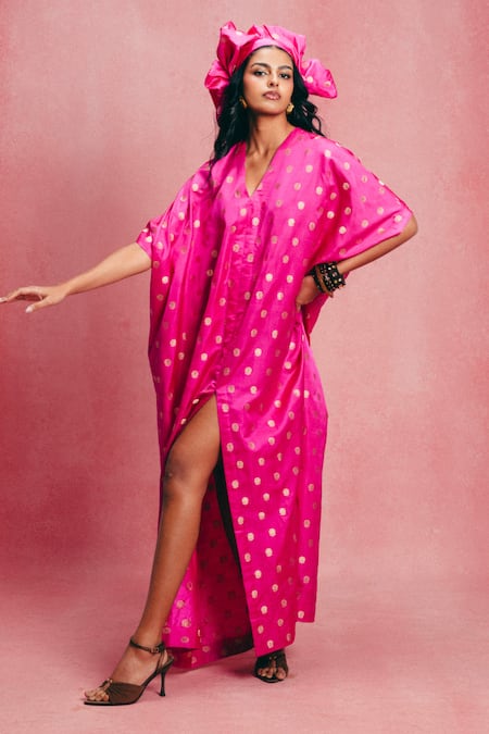 Pink Satin, Silk Zari V-neck Banarasi Cutwork Kaftan