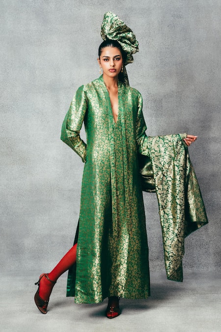 Ekaya Banaras Green Silk V-neck Handwoven Banarasi Emboss Kaftan
