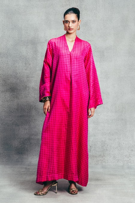 Pink Satin V-neck Handwoven Gerum Pattern Banarasi Kaftan