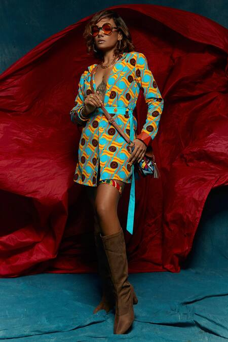 Blue Modal Satin, French Crepe Wave, Wheel Notched Lapel Printed Blazer Dress