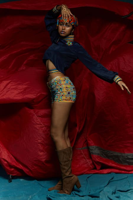 Blue Modal Satin Thread Round High Neck Sleeve Embroidered Top