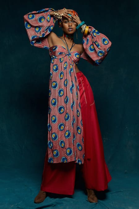 Pink Viscose Crepe Tennis Ball Sweetheart Neck Pattern Bralette Top
