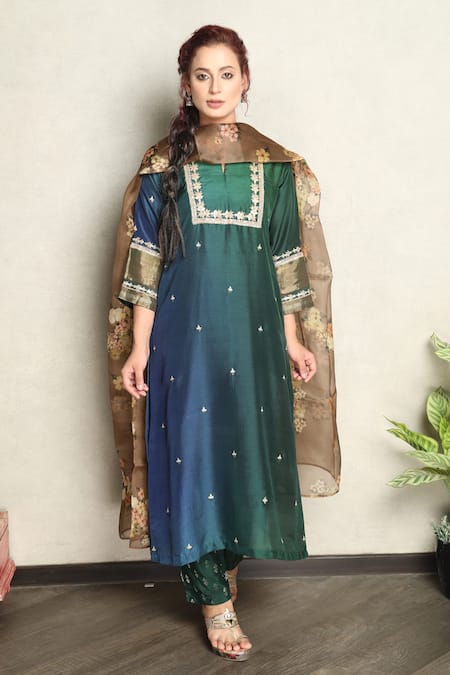Green Kurta Dupion Silk, Pant Viscose Gota Patti And Sequin Embroidered & Set
