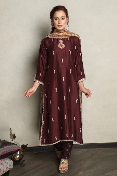 Brown Kurta Dupion Silk, Pant Viscose Thread And Sequin Embroidered & Set