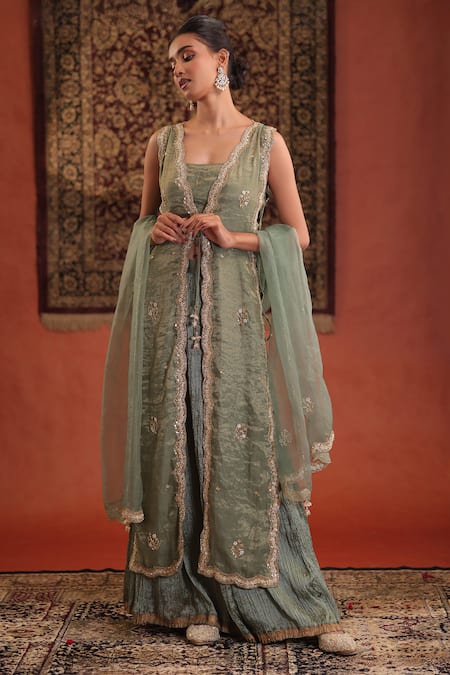 Mint Chanderi Silk, Tissue, Silk, Organza Embroidery, Sequins, Kurta Skirt Set