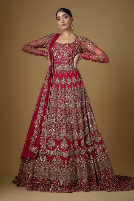 Red Tulle Zari, Crystals, Cut Work Round Hand Embroidered Anarkali With Dupatta