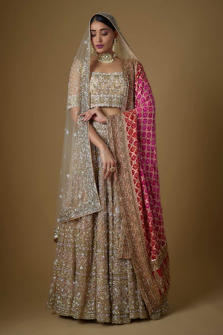 Gold Tulle Cut Work, Sequins, Zari Square Neck Hand Embroidered Lehenga Set