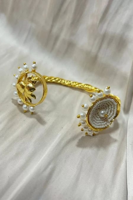 Gold Plated Pearls, Beads Lotus Motif And Embellished Bracelet
