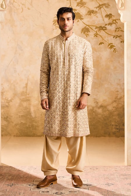 Beige Cotton, Silk Mirrors, Embroidery And Resham Jaal Kurta Set