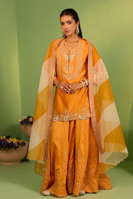Orange Chanderi Silk, Organza Embroidery V-neck Saphira Sharara Set