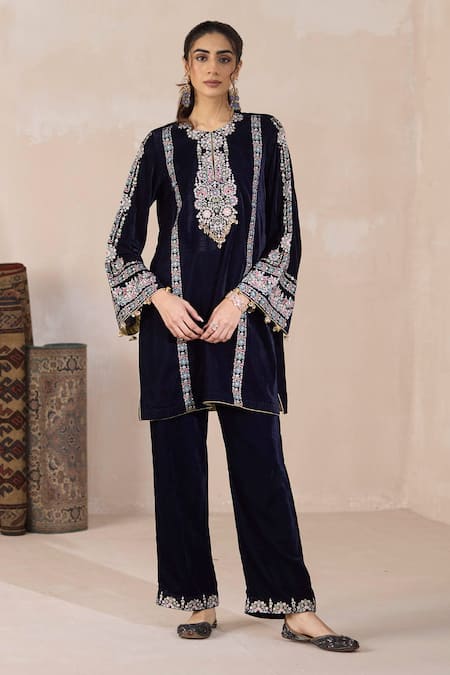 Blue Velvet Sequins, Embroidery Round Neck Kashmiri Kurta And Pant Set
