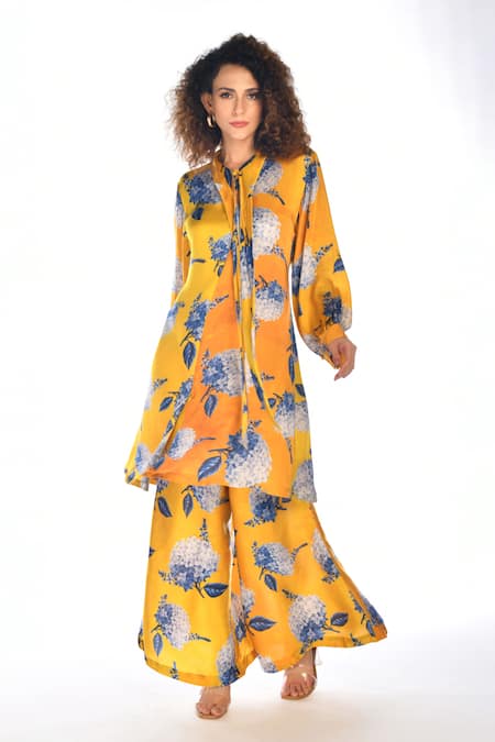 Yellow Satin, Georgette Split V-neck Digital Floral Print Kurta And Palazzo Set