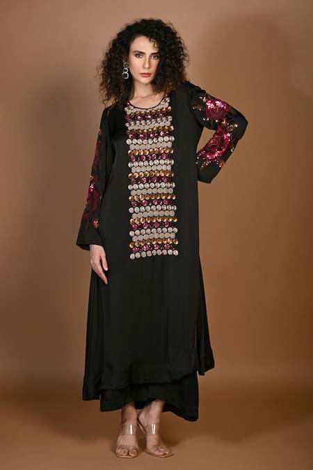 Black Satin, Georgette Sequins, Beads, Sequins, And Zardosi Embroidered Kurta Set