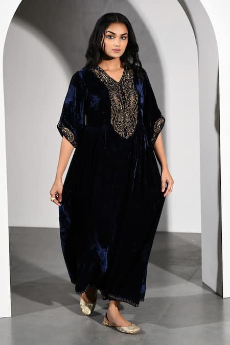 Blue Velvet Embroidery Zari V Neck Paisley Neckline Kurta
