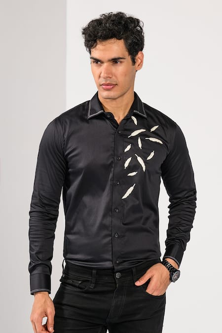 Black Cotton Embroidery Feather Fall Elegance Shirt