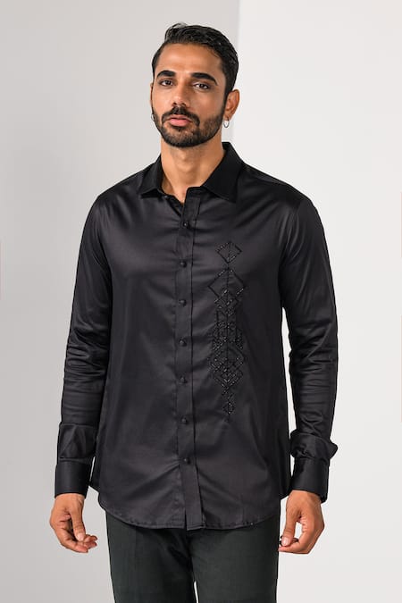 Black Cotton Embroidery Geometric Panel Thread And Cutdana Shirt