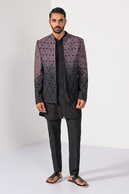 Black Bemberg, Silk, Cotton Embroidery Midnight Mauve Ombre Bandhgala Set