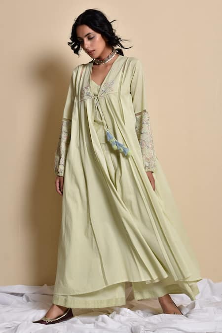 Green Inner Doby Jacket And Pant Flared Set With Embroidered