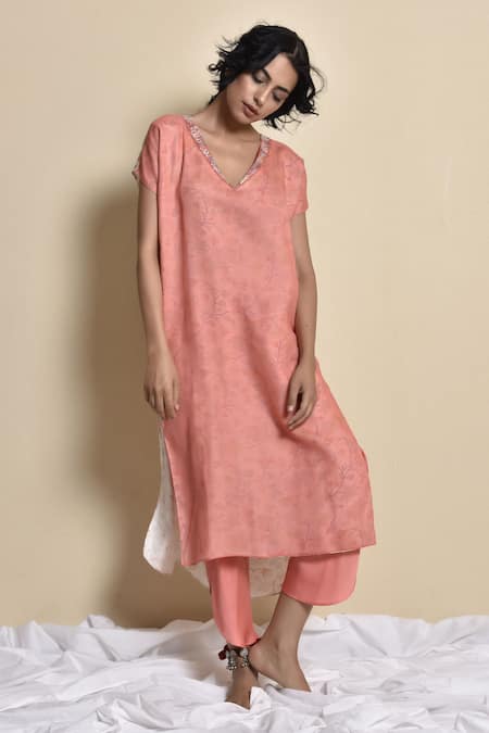 Pink Kurta Kota Pant Modal V Neck Floral Printed Set