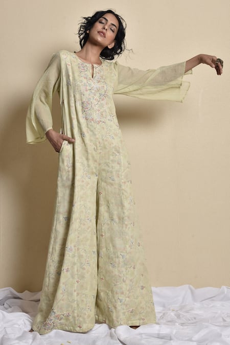 Green Kota Notched Round Neck Hand Embroidered Jumpsuit