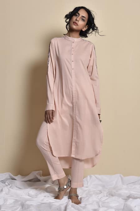 Pink Cotton Band Collar Embroidered Kurta Pant Set