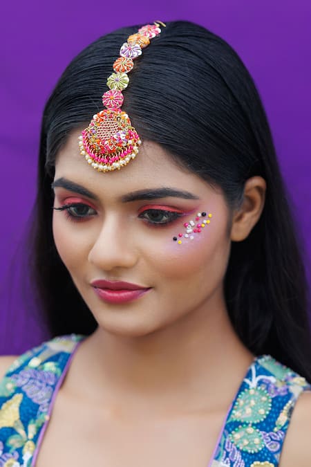 Multi Color Floral Embroidered Earring And Mangtikka Set