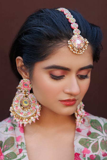 Multi Color Diamonds, Embroidery Floral Earrings And Mangtikka Set