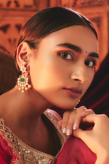 Green Pearls, Smocking, Stones Moissanite Polki Floral Square Earrings
