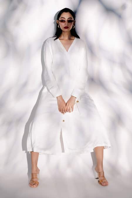 White Linen, Satin, Cotton V-neck Solid A-line Midi Dress