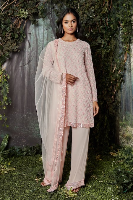 Pink Georgette, Net Embroidery, Cut Work Round Neck Kurta Pant Set