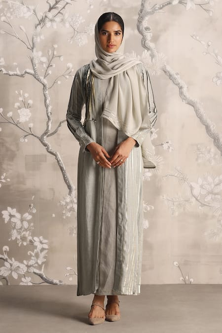 Blue Linen Foil Printing Pleated Abaya And Dress Set