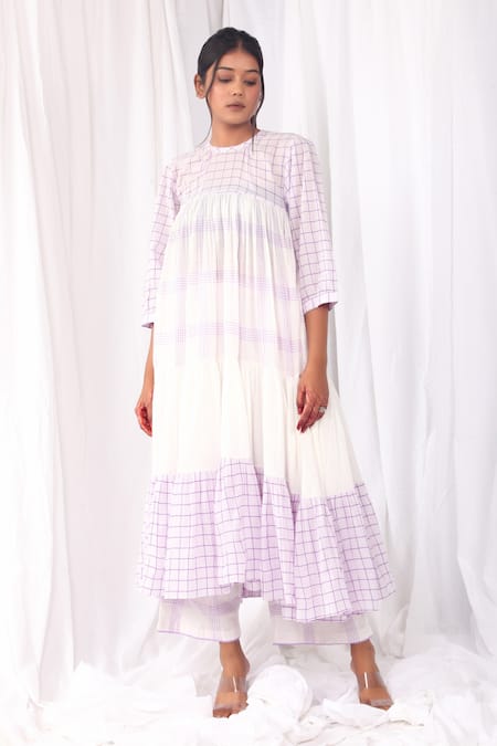 White Handloom , Round Neck Gathered Kurta And Pant Set