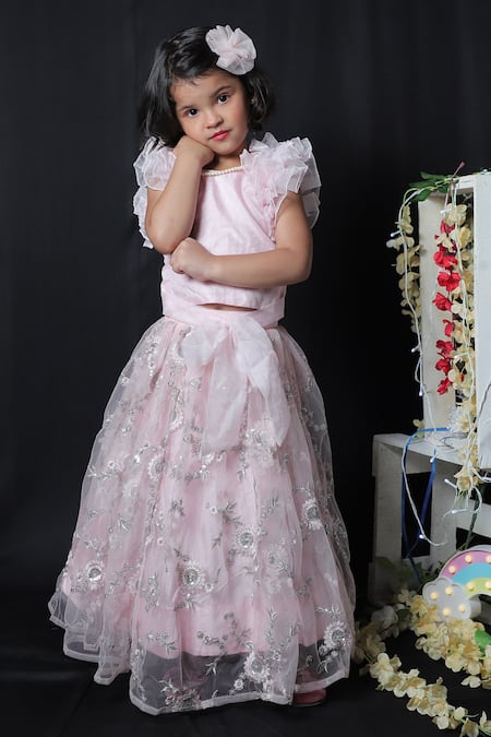 Pink Net, Organza, Silk Embroidery Ruffle Top And Lehenga Set