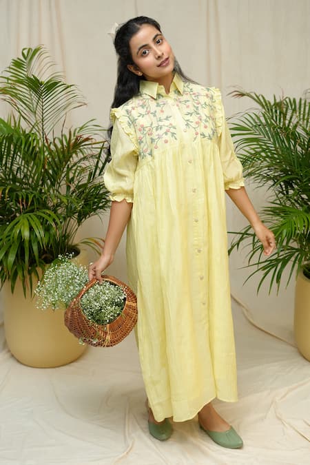 Buy_KKANYAAH_Yellow Silk, , Handloom Embroidery Collared Daffodil Delight Dress _Online_at_Aza_Fashions
