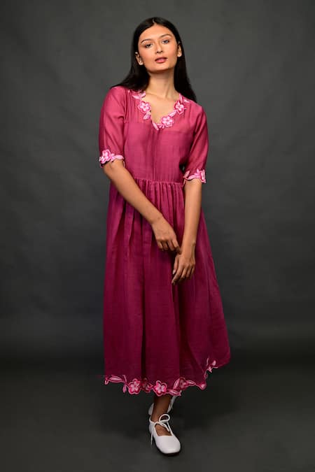 Buy_KKANYAAH_Wine Silk, Cotton Applique, Embroidery V-neck Floral Detailed Dress _at_Aza_Fashions