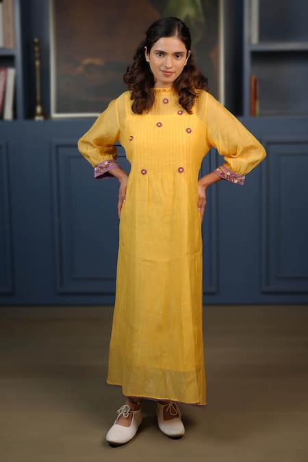 Buy_KKANYAAH_Yellow Silk, Cotton Embroidery, Lace Round Neck Retro Royal Midi Dress _Online_at_Aza_Fashions