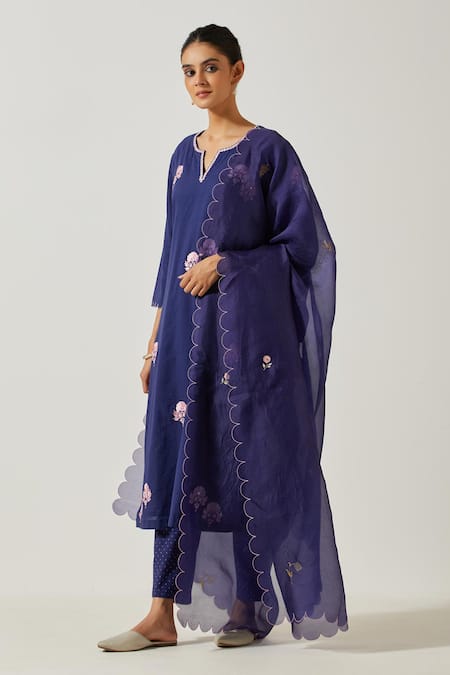 Blue Cotton Embroidery Split V-neck Floral Bloom Kurta With Pant