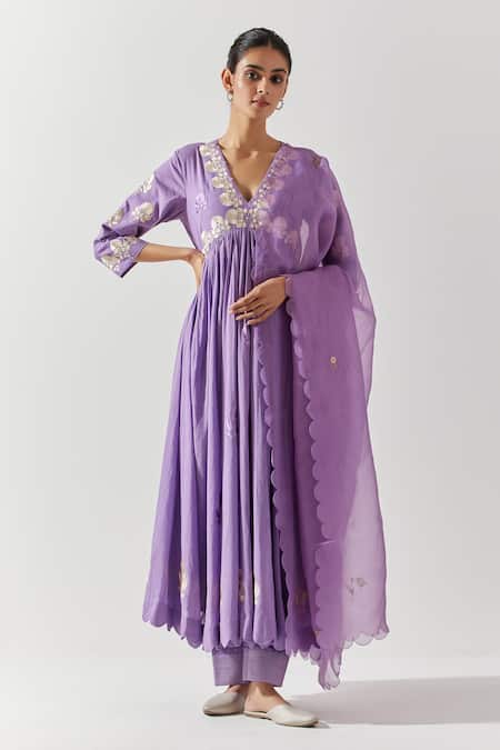 Purple Cotton, Chiffon Embroidery V-neck Floral Yoke Anarkali Pant Set