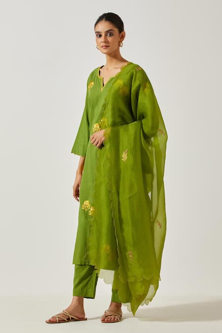 Green Cotton Embroidery, Mirrors Split V-neck Resham Butti Kurta With Pant