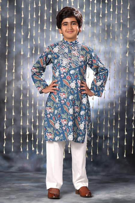 Blue Cotton Gota Patti Botanic Print Kurta With Pant