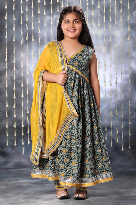 Grey Cotton, Chiffon Gota Patti Jaipuri Lily Garden Print Anarkali Pant Set