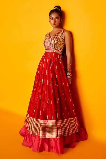 Red Dupion Silk V Neck Aarohi Layered Anarkali