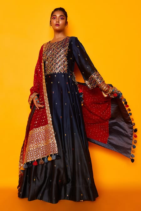 Blue , Chanderi Round Laya Anarkali With Dupatta